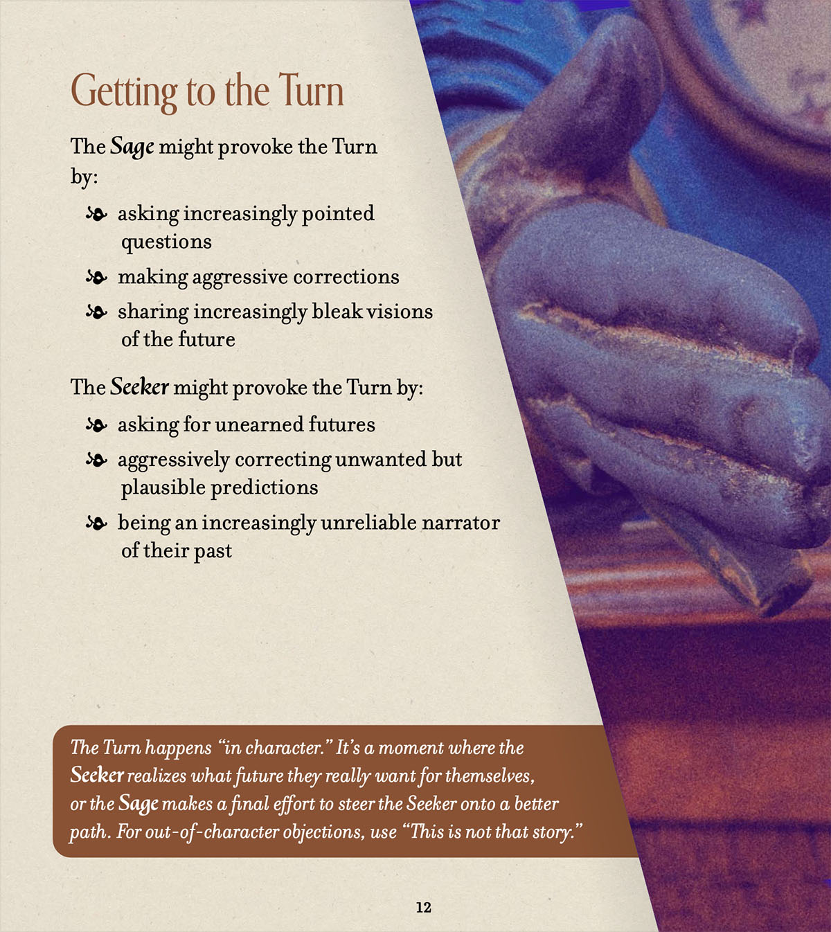 Eventually, one character will reach a breaking point—perhaps the Seeker rejects a vision of the future they'd do anything to change, or the Sage tries to break through the Seeker's denial and self-deceptions—triggering the Turn: