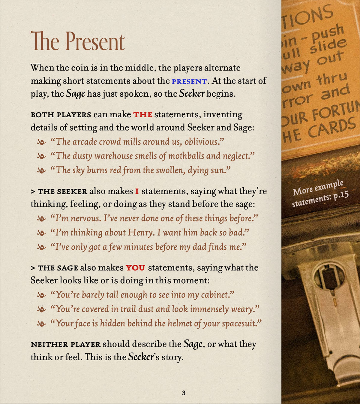 To play, all you need is a single coin (no dice, pencils, or character sheets) which Sage and Seeker will push back and forth to move the conversation between past, present, and future.
